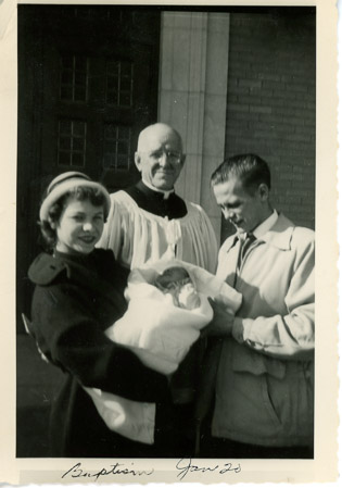 Chuck's baptism with Monsignor Conrad, Beverly (Beach) Licktieg, Howard Brennaman (Proxy)