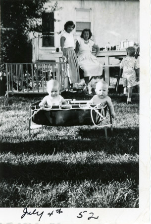 Six months old with cousin Mike (5 months old). In the background are aunts Aileen Blowers Brennaman, Mary Loftstrom Brennaman and an unnamed cousin.