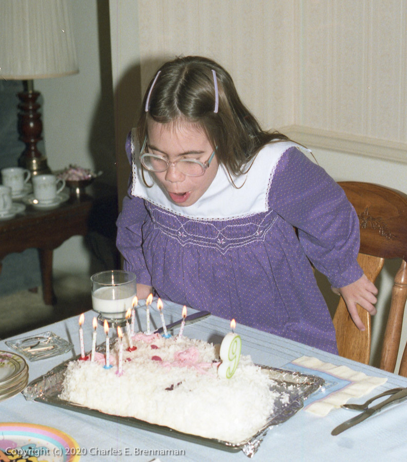 1988 Christine's 9th birthday party: Christine blowing out candles.