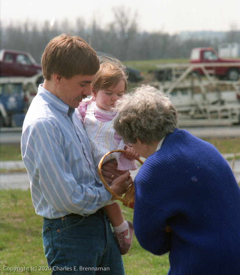 1988 Easter at Mom and Dad's house: My brother Alan, his daughter (my niece) Kelsey, and Mom checking out Kelsey's basket.