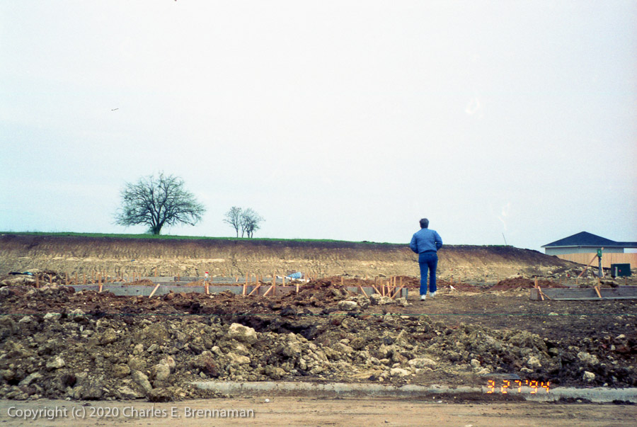 1994 House Construction: 3/27/1994 Utility trench dug. Foundation cables and pipes delivered. Foundation forms in place. I look over footprint