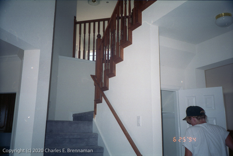 1994 House Construction: 7/25/94 Most of the brick on house complete. Fence posts being installed. Carpeting installed. View of the steps from entryway.
